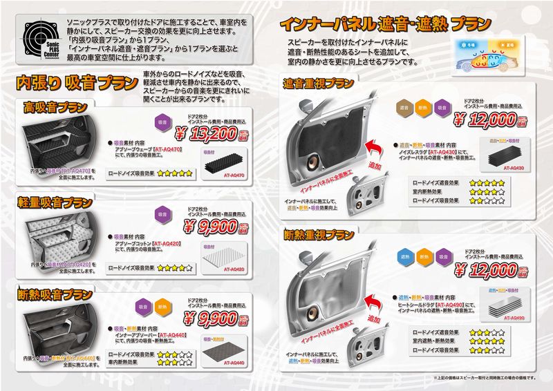 | 車種により、取付け面鉄板加工・トゥイーター埋め込み加工・イナンーバッフルが必要な場合は、別途費用が掛かります。 |
