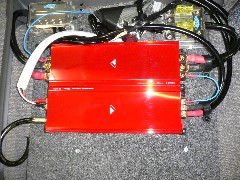 | ダイヤトーンのサウンドナビの内蔵アンプを使い、ビーウィズのトップモデルスピーカー・サンライズを駆動しています。シート下にはサブウーファー用のアンプとレギュレーターが収まっています。流石に音の細かさや情報量は豊富です。 |