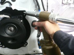 人気なプリウスαにソニックデザインの専用スピーカーを取り付けいたしました。今回はちょっと取付のお話をいたします。純正スピーカーはほとんどの車がリベットで取り付けされています。ソニックプラスの取り付けはリベット取付のため、純正リベットを一度壊し、新たにリベッターを使いリベットを打ちます。これをすることで、何年経ってもネジみたいに緩むことはありません。またしっかり固定される為音質にも影響があります。さらに当店では音質アップを狙い、スピーカーの周りを制振いたします。ネットワークや配線類も共振しないようしっかりと固定・吸音いたしております。再生した音質は、クリアで繊細な音を細かく再生いたします。また純正だと下側にいた定位感も上がり、スピーカーの存在を感じさせません。