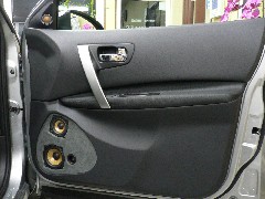 千葉県からお越しいただきました新車のデュアリスです。今回はお客様お持ちのプロセッサーとアンプを使いシステムを決めました。純正ナビ付きの為、純正には手をつけず、メインユニットにCDより音がいいかもしれないミラーメディアを使用します。それにアルパインH900のプロセッサーの機能を使い、ソニックデザインのスピーカーを鳴らします。H900のフェイスはエアコン下に埋め込み、もともとあったスイッチ類は違う場所に移植しました。ドアにはSD-77とUNIT100がドア一体型で製作してありますが、SD-77は実は純正の音声スピーカーになっています。トランクは荷物のことを考え、フラットになっています。カバーを外すとアンプ類があり、アンプラックを持ち上げるとスペアタイヤが外せます。