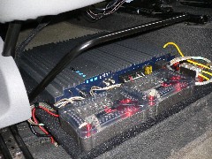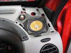 | 純正のCDプレーヤーはそのままで、アンプとスピーカーを取り付けいたしました。フロントスピーカーがダッシュにあり、口径の関係で10センチスピーカーです。その為低音が足りない為、助手席下にサブウーファーを取付全体のバランスを整えてあります。 |
