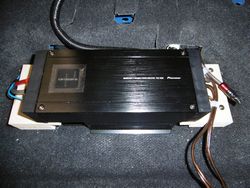 サブウーファーを再生させるためにカロッツェリアのパワーアンプを、助手席シート下に取付いたしました。