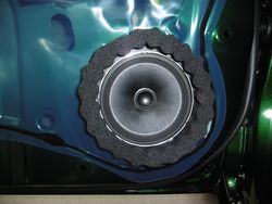ドアスピーカー取り付けには専用のバッフルを製作ししっかり固定し、排圧処理や音の抜けが良くなるように防振材などを使用して取付けいたします。