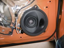 純正のスピーカー口径が小さいので、鉄板をカットして取付できるサイズに広げます。