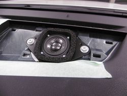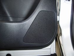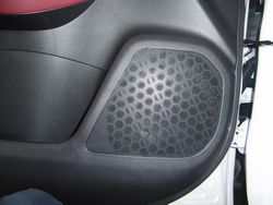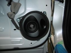 リアスピーカーは5cmくらいのスピーカーがバスレフエンクロージュアに収まって内装側に取付されていましたが、今回はドアにSP-P30REが取り付けできたので取付いたしました。ただ内装側のグリルが塞がっていた為加工させていただきグリルネットで作り変えています。