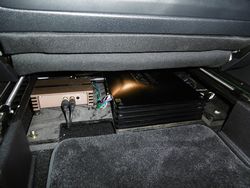 プロセッサーアンプは6チャンネルアンプ内蔵のP-SIXを使いマルチでスピーカーを駆動・調整いたします。サブウーファー用のアンプはビーウィズを使用しました。これらは助手席シート下に取付いたしました。