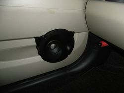 パッソの純正はダッシュにスピーカーがあり、ドアにありませんので今回内装をカットして取付けいたします。