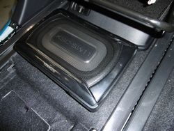 お持ちのサブウーファーを運転席シート下に取付いたしました。
