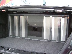 トランクルームが広くなり、重量もアンプ・プリアンプ・サブウーファーが載せてあった時はユニット重量と化粧パネルで約70kgあったのが、今回は7kgと軽量になりました。電源も小電源ですむので、車両への負担も少なくなります。