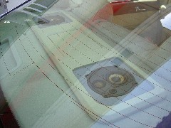通常フーガのリアスピーカーはリアドアに付いていますが、全ポジションで臨場感ある空間を作る為に、リアトレイに取り付けました。 |